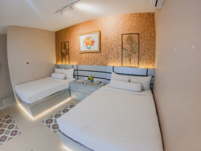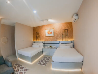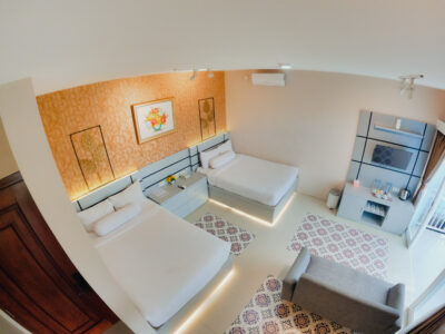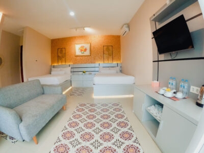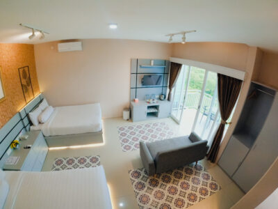 Our Resort Room is the crown jewel of Pesona Ketep, offering an unparalleled resort-style experience. Featuring two large beds and a private bathtub, this room is meticulously crafted for ultimate group comfort. Step out onto the private balcony to witness the grandeur of Merapi while sipping on your warm tea. Every detail is catered to your group’s needs, from the four welcome drinks upon arrival to a full breakfast spread for four. Whether you’re soaking in the tub or relaxing under the AC, the Resort Room promises a high-end experience in the heart of nature.