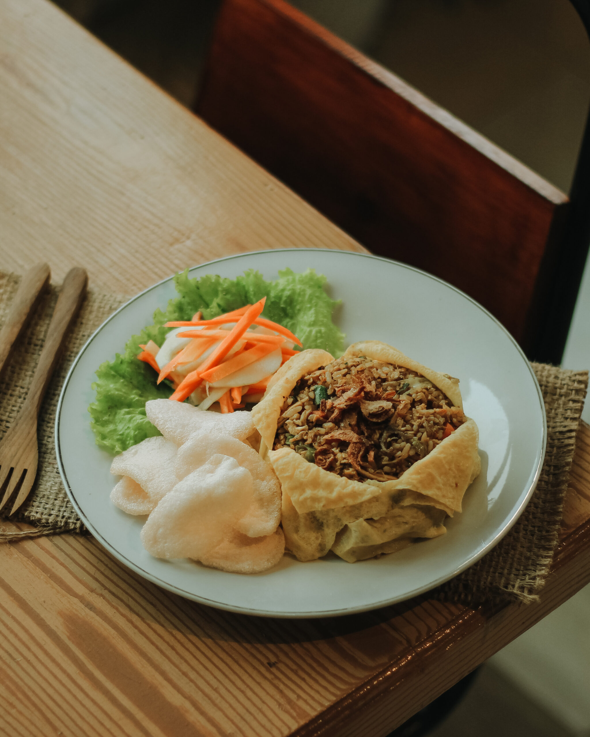 Elegant, savory, and satisfying. Our Nasi Goreng Pesona features aromatic fried rice perfectly wrapped in a golden omelet. A classic Indonesian comfort dish leveled up for your soul.